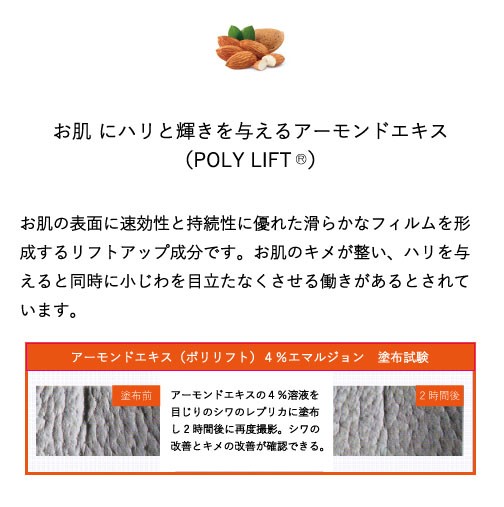 | 素材 | BG、水、プセウドジマツクバエンシス/(オリーブ油/グリセリン/ダイズタンパク)発酵物、エタノール、リンゴ果実培養細胞エキス、オリーブ果実油、オリーブ葉エキス、スクワラン、ヒアルロン酸Na、アーモンドエキス、テトラヒドロピペリン、ポリソルベート60、キサンタンガム、グリセリン、レシチン、フェノキシエタノール、ベルガモット果実油 |